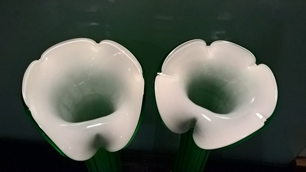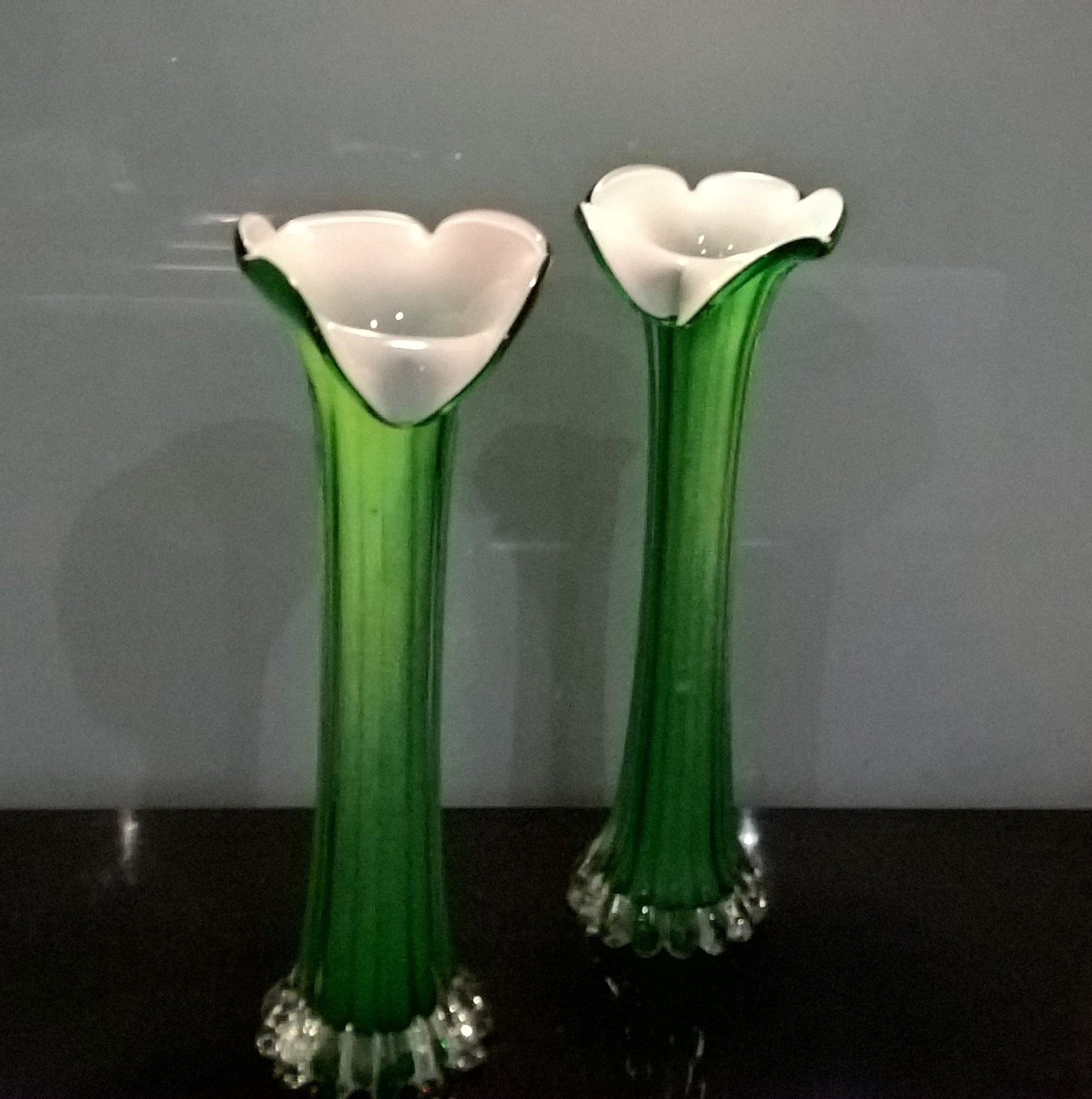 Two hand blown Murano Italian Art Glass green and white vases. In the form of the Calla Lily, or ‘Jack in the Pulpit’. These stand approximately 12″ tall, with fluted columns, and are in exceptional condition. Postage possible at cost.